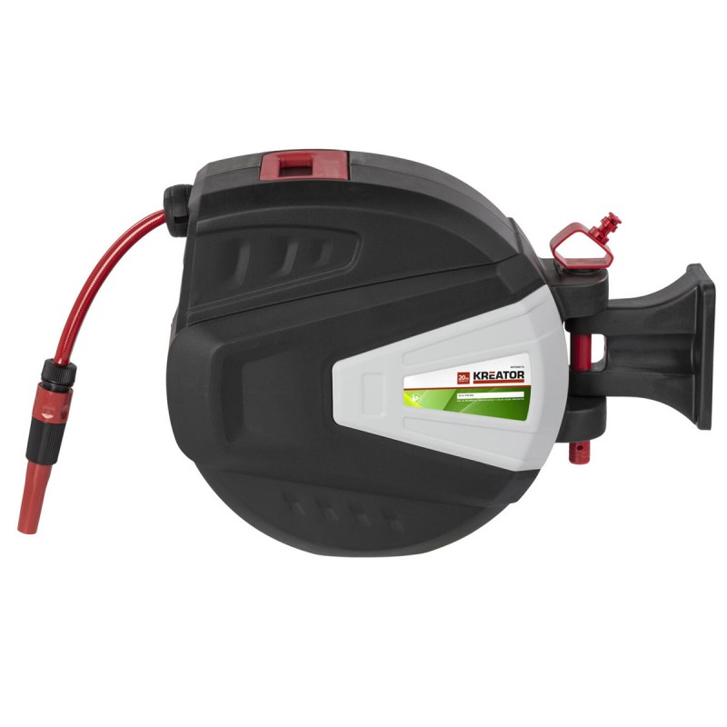 Ce dérouleur mural de tuyau d'arrosage Kreator est particulièrement pratique puisqu'il vous permet d'arroser facilement et d'ensuite ne pas être encombré d'un tuyau après en ré-enroulage rapide !