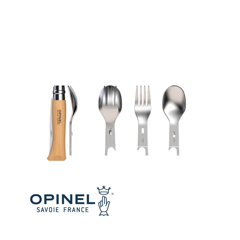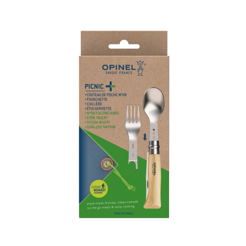 L'Opinel Picnic +, conçu avec le designer Franck Fontana, offre une solution ingénieuse pour des repas nomades et confortables. Ce kit comprend un couteau N°08, deux inserts en acier inoxydable (fourchette et cuillère) qui se fixent sur le manche du couteau, et un étui-serviette microfibre pour le rangement et le nettoyage. Les inserts sont compatibles avec les couteaux N°08 traditionnels à manche en bois avec bague double sécurité.